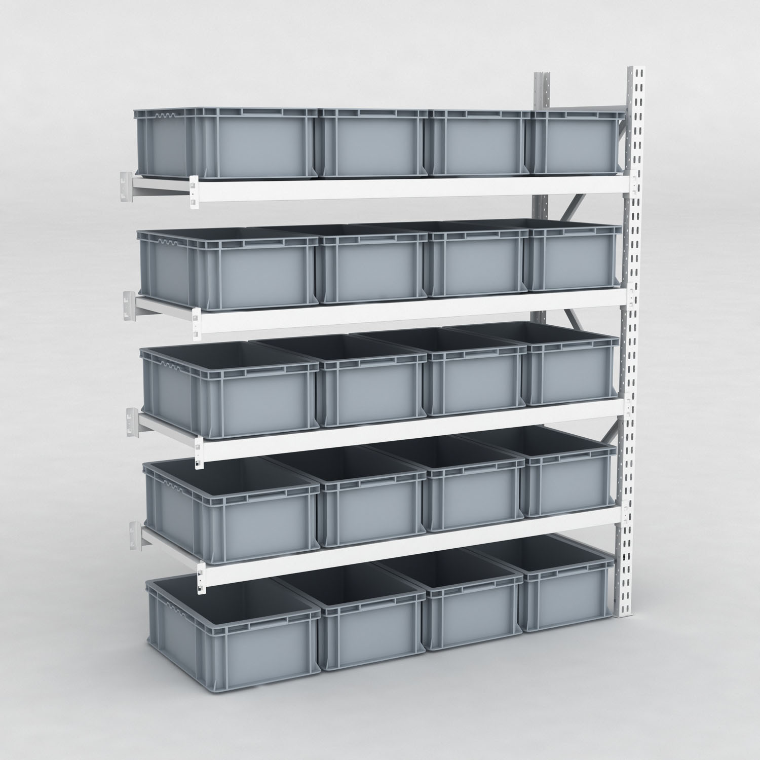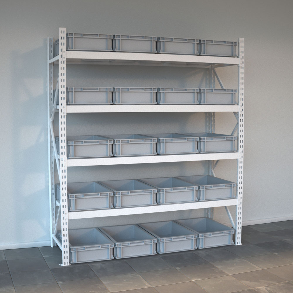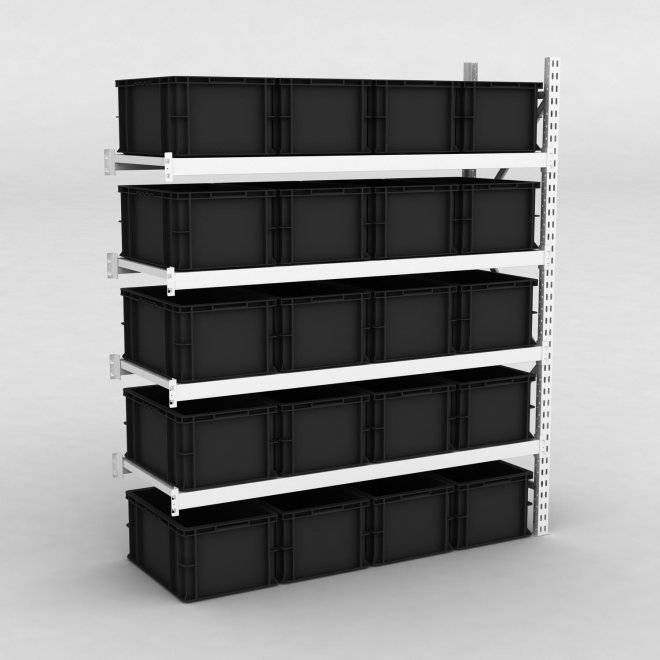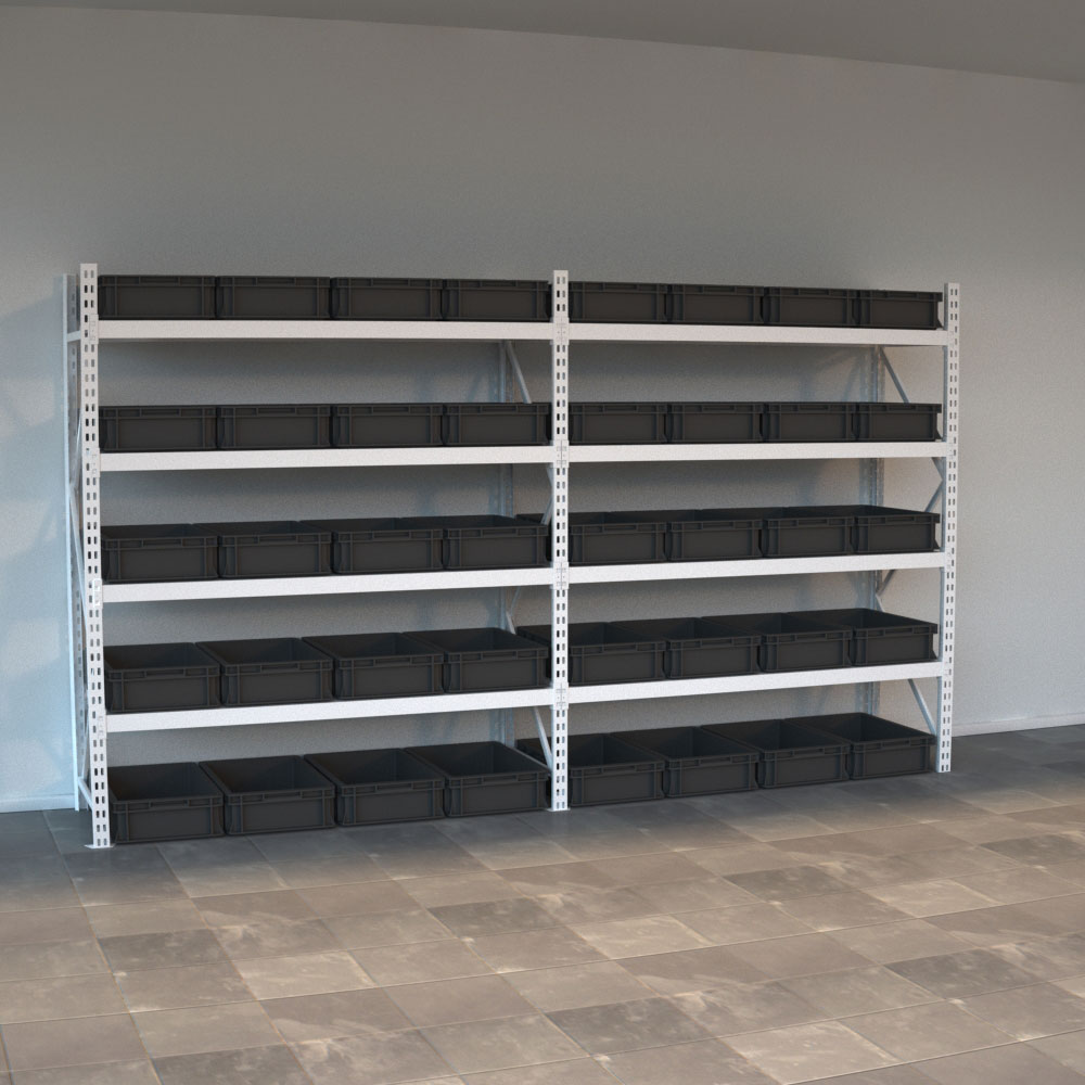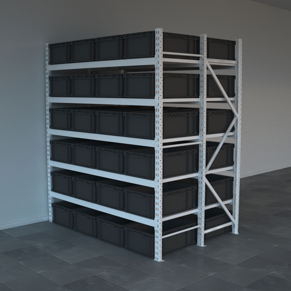 Lagerhylla med plastlŒdor, djup 60 cm.